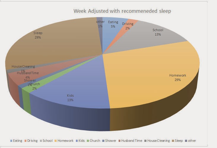 Seriously- it is kinda scary the things that can happen to you if you don’t sleep!! SO I began wondering about myself- and charted out an IDEAL week for me (one where I got in all of my homework and hung out with my family and whatnot) here is the chart that details what that week looks like for me: