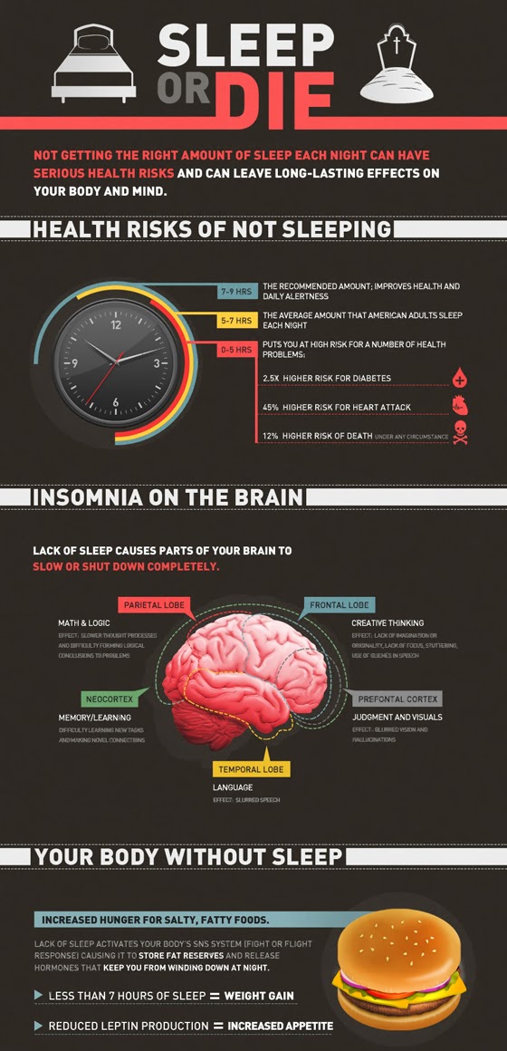 This one is very straight forward and simple. I found it interesting because weight gain has been a severe problem for me over the past few years. (source of graphic) It makes sense that sleep is something that refuels our bodies and when we deprive our bodies of that essential function then we have to re-fuel somehow. What are we drawn to? Quick forms of energy- and those are generally unhealthy. Go Figure.