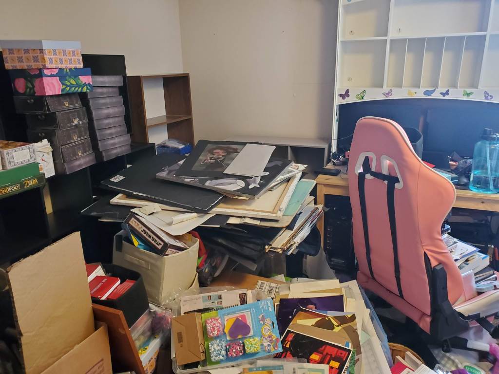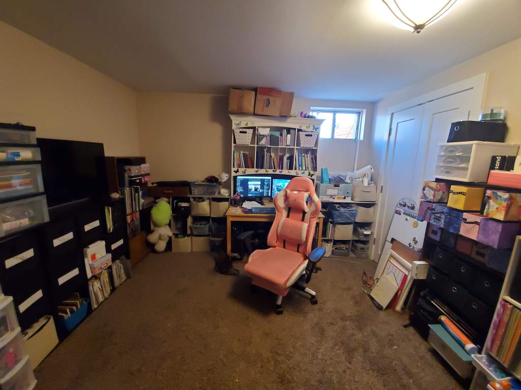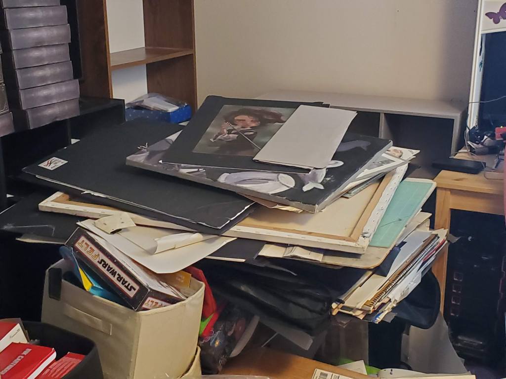 it needs a LOT of work. Also, all of my furniture is second hand stuff I’ve gotten from yard sale sites over the past 15 years. With the exception of my drafting table, I bought the cheapest one i could find brand new when I was in my first years of art school. My goal is to have it all sorted and put away by the end of September. Hopefully I can do it this time I’ve made goals like this in the past and then ended up working on other parts of my home and neglecting my space. Anyway I hope the post is allowed, hopefully it’ll make a few of you laugh and to those of you like me that have a knee deep mess, I’m with you sister!”