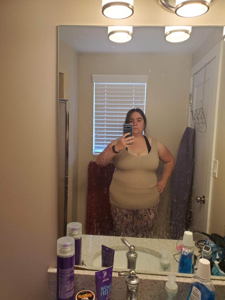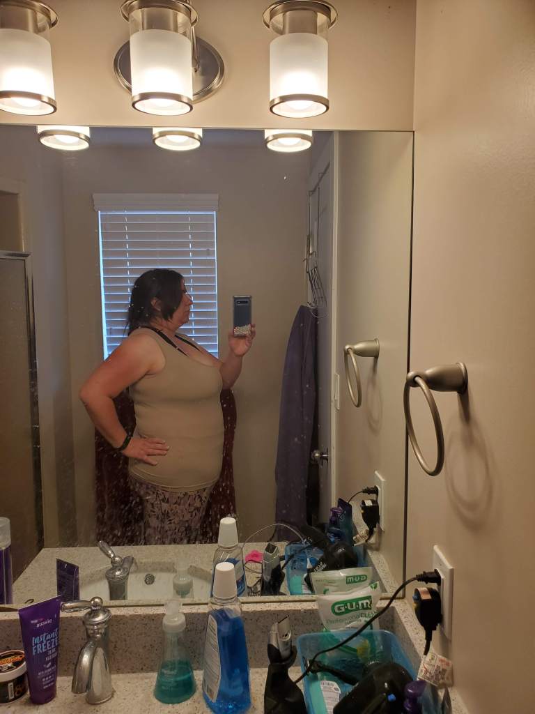 Even as big as I am- for whatever reason I tend to carry my weight super close to my bones. Which makes me look a little smaller than I am. Not that I’m small- oh no; no one seeing me walking down the street would be like ‘look at that little thing’. I’m absolutely an obese woman. But in those phots I’m wearing my loosest workout clothes, so that’s really what my body looks like- it’d only be more accurate if I posed naked. I’m not doing that. (the waist band is tucking me in a little; but not much)